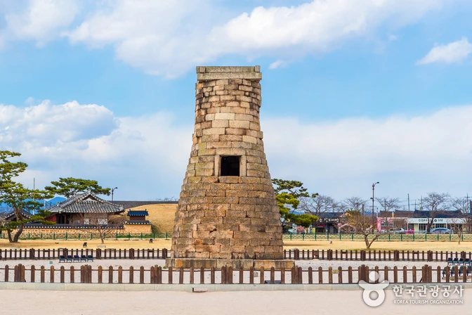 첨성대는 신라 제27대 선덕여왕 때 건립된 것으로 추정되며 경주를 상징하는 랜드마크 중 하나이다. 받침대 역할을 하는 기단부(基壇部) 위에 술병 모양의 원통부(圓筒部)를 올리고 맨 위에 정(井) 자형의 정상부(頂上部)를 얹은 모습으로 높이는 약 9m이다. (자료출처 : 대한민국 구석구석 - korean.visitkorea.or.kr)