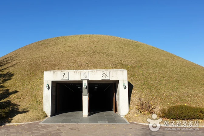 경주 대릉원 안에 있는 천마총은 5세기 말에서 6세기 초에 축조된 고분으로 추정되며 1973년에 발굴된 신라 특유의 돌무지덧널무덤이다. 높이 12.7m, 지름 50m의 능으로 봉토 내에는 냇가의 돌로 쌓은 적석층이 있고, 적석층 안에는 길이 6.5m, 너비 4.2m, 높이2.1m의 나무로 된 방이 있어, 그 중앙에 목관을 놓고 시신을 안치했다. (자료출처 : 대한민국 구석구석 - korean.visitkorea.or.kr)